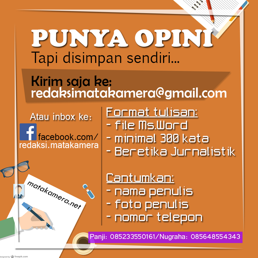 Warganet! Siapapun Anda. Penulis, bukan penulis, politikus, dosen, guru, mahasiswa, dan warga dari unsur lainnya, redaksi Matakamera menerima karya tulis dalam bentuk opini. Opini bisa mengulas tentang isu politik, sosial, pendidikan, dan peristiwa yang terjadi disekitar Anda. Opini yang bagus, bernilai, berbobot, dan sesuai kaidah penulisan opini yang beretika akan dimuat di kanal khusus OPINI matakamera.net. Jadilah penggerak perubahan dengan meyerukan pemikiran-pemikiran kritis dan membangun. Melalui tulisan buatlah perubahan!!! Cek...