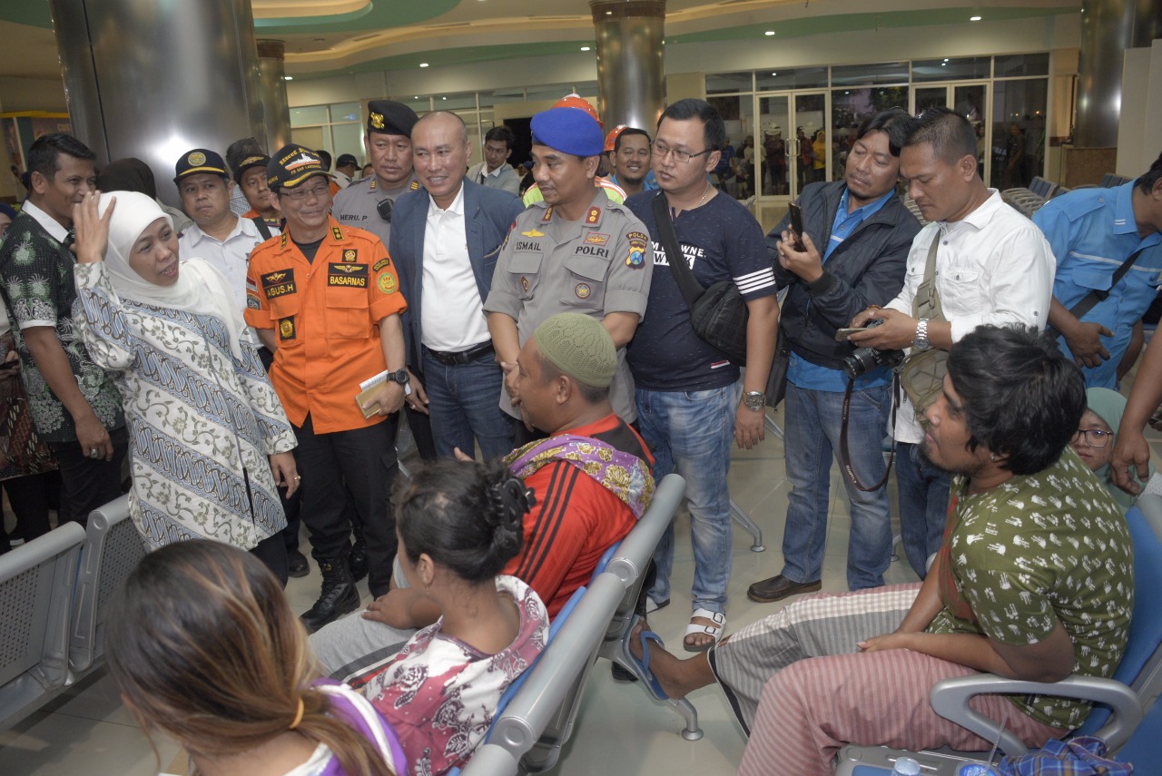 matakamera, Surabaya - Gubernur Jawa Timur, Khofifah Indar Parawansa menyambut kedatangan korban terbakarnya KM Santika Nusantara yang tiba di Terminal Gapura Surya Nusantara, Sabtu sore 24 Agustus 2019.