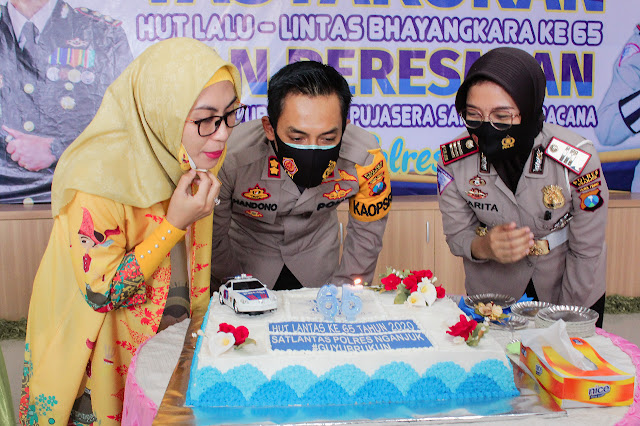 | Kapolres Nganjuk AKBP Handono Subiakto, Ketua Bhayangkari dr Nina Subiakto dan Kasatlantas AKP Marita Dyah A, meniup lilin HUT ke-65 Satlantas |