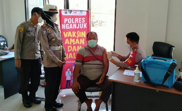 | Layanan vaksinasi bagi pemohon SIM di Satlantas Polres Nganjuk merupakan tindaklanjut dari program Gerebek Vaksinasi yang digagas Kapolda Jatim |